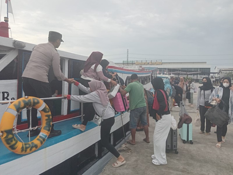 Petugas juga aktif memberikan imbauan kepada penumpang agar menggunakan pelampung selama perjalanan, menjaga anak-anak, tidak merokok di atas kapal, dan mematuhi aturan keselamatan demi kelancaran perjalanan.