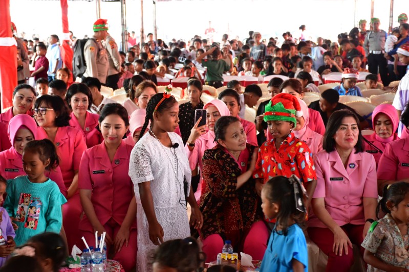 Ketua Umum Bhayangkari Pusat, Juliati Sigit Prabowo, merayakan Natal bersama para korban erupsi Gunung Lewotobi di Desa Kobasoma, Kecamatan Titehena, Kabupaten Flores Timur, Nusa Tenggara Timur (NTT), Sabtu (28/12/2024).
