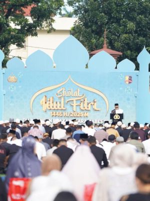 Salat Idulfitri kali ini dipimpin oleh Prof. Dr. K.H. Asafri Jaya Bakri, M.A., yang dalam khutbahnya mengingatkan pentingnya menjaga ketakwaan, mempererat silaturahmi, serta memperkuat sinergi antara aparat kepolisian dan masyarakat.
